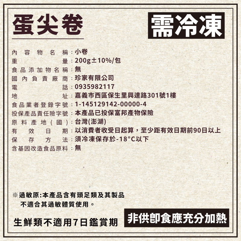 ◍品名:船凍鮮甜蛋小卷 ◍商品重(容)量:200g±10%/包 ◍內容物名稱(成份):小卷 ◍原產地(國):台灣澎湖 ◍包裝:袋裝 ◍保存方式:-18°C冷凍保存 ◍製造廠商或國內負責廠商名稱:珍家有限公司 ◍製造廠商或國內負責廠商地址:嘉義市西區保生里興達路301號1樓 ◍製造廠商或國內負責廠商電話:0935982117 ◍食品業者登錄字號:I-145129142-00000-4 ◍投保產品責任險字號:本產品已投保富邦產物保險 ◍生鮮類不適用7日鑑賞期 備註欄: ※過敏原資訊:本產品含頭足類 ※圖片僅供參考,依實際供貨商品為準。 ※商品如經拆封、使用,以致缺乏完整性時,恕無法退換貨。 ※商品屬於易於腐敗商品,依通訊交易解除權合理例外情事適用準則第2條第1款規定,不適用消費者保護法第19條之適用。因商品因消費者保存方式不當導致腐敗,基於食品安全,亦同。 (1)商品內容物以實物為準,商品顏色可能因各顯示器設定而有差異。 (2)本商品為食品,基於衛生考量,一經拆封恕無法退貨。 (3)商品若於送達時即有損壞,請於收貨後立即拍照存證,並立即聯絡客服人員。 一般家庭冰箱,冷凍僅約-18°C,建議購買後盡早食用。 有別於業務型-24°C冷凍設備條件,將無法長期儲存。