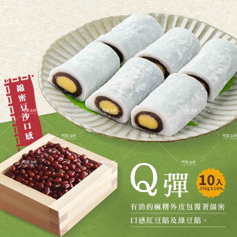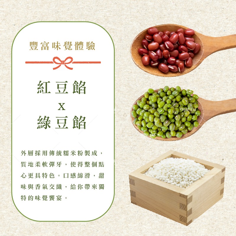 以Q彈有勁的麻糬外皮,包覆著綿密的紅豆餡及綠豆餡,
