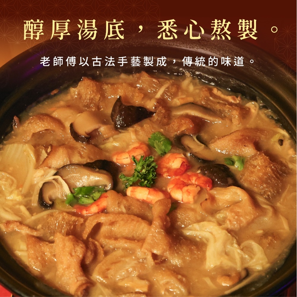 以大白菜、筍絲、金針菇慢火熬煮,湯頭濃郁溫潤、不死鹹。