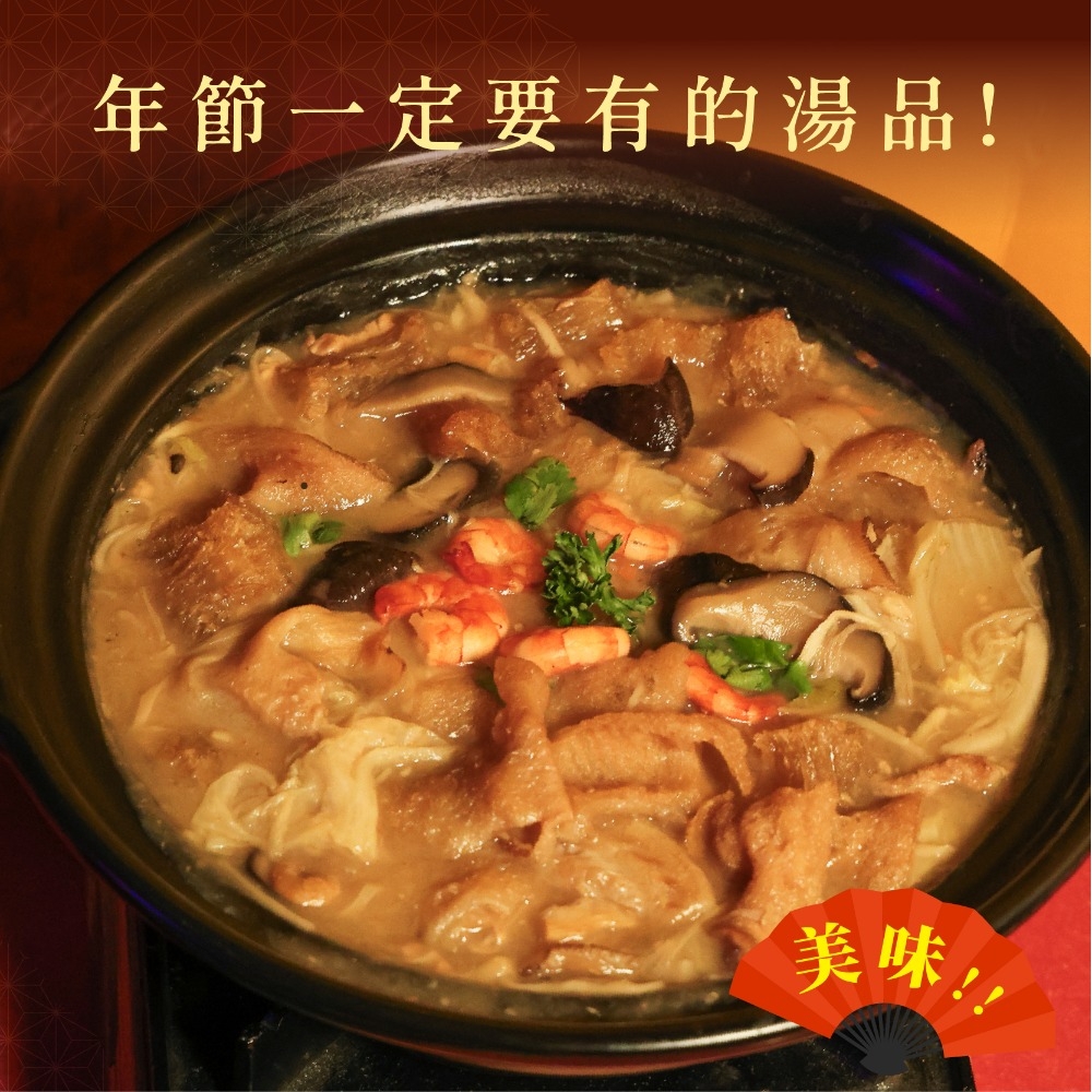 再加入魚翅、腳筋、豬肉絲、蝦仁肉、蝦米與香菇絲,海陸香氣層層堆疊,每一口都是熟悉的年節滋味。